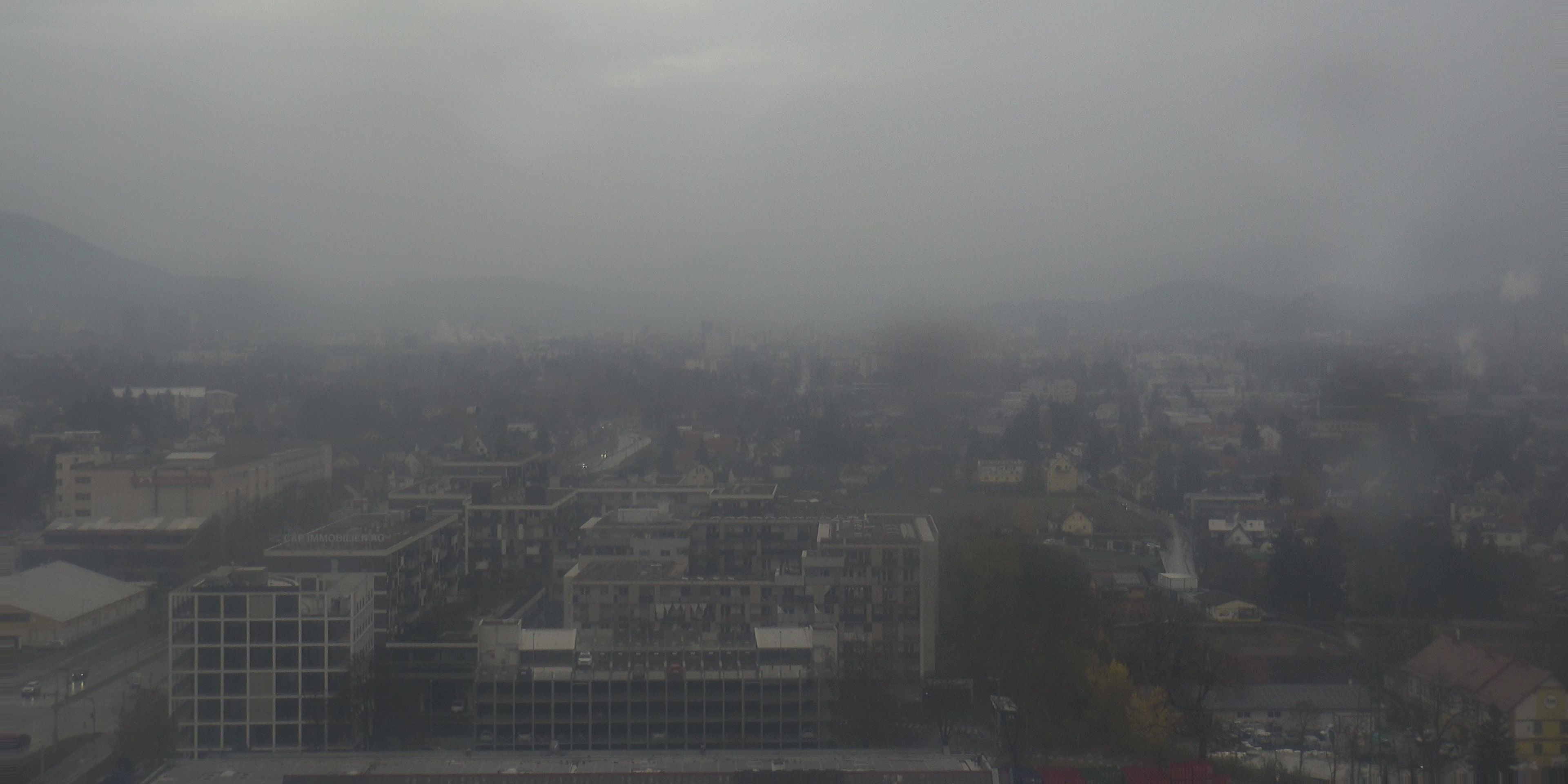 Gesamtpanorama vom Kamin der Brauerei, Blick zum Schloßberg und zum Schöckl